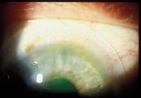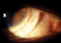 On follow-up examination after the patient received the lenses, slit lamp examination demonstrated a well-centered lens with 1mm to 2mm of apical clearance (Figure 1). The lens showed no movement at all and we found significant blanching of perilimbal conjunctival vessels. The blanching pattern exhibited bands of blanching and engorgement, denoting decreased conjunctival capillary perfusion due to compression (Figure 2). We instilled sodium fluorescein three times and found no evidence of tear flow under the lens after 15 to 30 minutes.