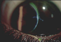 Seven months later the patient returned for his first follow-up examination. He had been out of the country on an archeological dig and had been unable to respond to our attempts to schedule a follow-up appointment. Fortunately, the patient hadn't been wearing the lens because of discomfort and thus no corneal damage had occurred. Examination revealed significant inferior decentration of the lens most likely because of its excessive mass. Dyna Intralimbal lenses usually center exceptionally well, but when they don't, attempt to correct the problem by decreasing the mass.