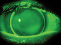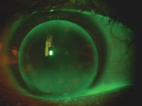 For my patient, I fit her with 9.6mm-diameter bitoric lenses with these base curves: OD 41.75/44.75, OS 42.50/45.50. Notice that I fit the flat and steep meridians a little differently; each lens is 0.50D flatter than K in the flat meridian and 1.50D flatter than K in the steep meridian. This type of bitoric fit is called low toric simulation because it mimics the way a spherical lens would fit on a cornea that has 1.00D corneal cylinder, which is ideal: It has just enough of a rocking movement for good tear exchange and smooth vertical movement with the blink. Figure 2 shows how a bitoric lens looks just like a spherical lens would on a lower-cylinder cornea (though the lens in this photo is a little steep).