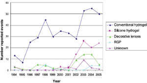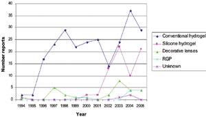 The predominant lens type associated with adverse events reported to the FDA has been hydrogels. The number of reported MK events by lens type shows that the occurrence with hydrogels has been fairly static over the last 10 years, averaging 24 reports a year. In 1996, all reports were with hydrogel lenses. However, the proportion of reports related to hydrogels has decreased in recent years, probably because of increased prescribing and manufacturer clinical study of silicone hydrogels. In 2005, hydrogels accounted for 60 percent of reports.