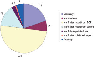 There were no manufacturer-reported events for 1994 or 1995 because the MAUDE database did not tabulate such events until August 1996. Instead, practitioners or patients voluntarily reported the 27 total events in 1994 and 1995. Excluding the MAUDE data from 1994 and 1995, approximately 75 percent (417/557) of the contact lens-related adverse event reports originated through manufacturers (Figure 3) during the time from 1996 to 2005. About 5 percent (29/557) of reports followed communication from a patient's attorney, either directly to the FDA or via the manufacturer or practitioner. Less than 1 percent (5/557) of events came from manufacturers after a case report in a peer-reviewed journal showed that their lens was involved with a significant adverse event. With one-fifth of reports since 1996 reported on a voluntary basis, practitioner or patient bias may have resulted in an under- or over-reporting of events for certain lens types.