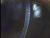 Vision was OD and OS 20/15 with refraction giving +0.25D OU. The real shock came with the slit lamp examination. Both corneas exhibited a central circular area of haze about 3.00mm in diameter. There was a "granular" epitheliopathy, mild disruption of Bowman's Membrane and stromal haze extending to approximately 25 percent of the corneal thickness (Figure 1). The palpebral conjunctiva showed grade 3 follicles and hyperemia.