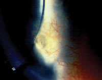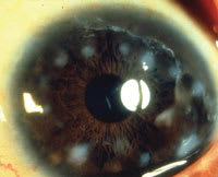 VLK lesions appear similar to those found in Salzmann's nodular degeneration (Figure 3). Salzmann's nodules are elevated lesions that appear in corneas with a previous history of chronic inflammation. Typical lesions present as bluish-grey, elevated, fibrous nodular masses in the superficial stroma. The lesions are often arranged in a circular fashion around the midperiphery with clear intervening cornea between the nodules. The nodules tend to occur near or within an area of previous scarring or at the edge of a pannus as in Figure 3. Histologically, Salzmann's nodules frequently reveal a thinned epithelium across the lesion with disorganization of the underlying Bowman's layer and anterior stromal collagen secondary to the formation of collagen plaques.