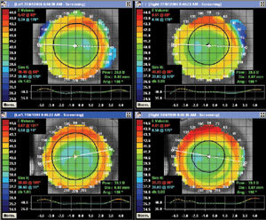 Patient JJ was originally fit with ortho-k lenses in 1996 when his refraction was OD –2.75 –0.50 x180 (20/15) and OS –2.75 –0.50 x170 (20/15). He was 15 years old at the time and an unsuccessful soft lens wearer because of low-grade allergies and constant symptoms of ocular dryness. His entire family were patients of the practice. He very successfully adapted to overnight ortho-k with excellent results, achieving +0.50D sphere OD and OS and unaided VA of 20/15.