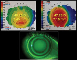 We then introduced EH to the concept of overnight corneal reshaping (of one eye only), and the technique intrigued him. We subsequently fit him with the corneal steepening Paragon CRT lens design, which steepened his cornea approximately +2.00D (Figure 1). EH has been extremely pleased with his new freedom from the daily wearing of glasses and contact lenses. His distance visual acuity remains 20/15 through his uncorrected eye and 20/15 at near through his overnight corneal reshaping eye.