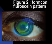The desired fluorescein pattern is a slight apical touch of 2mm or less to slight apical clearance (Figure 2). Too much apical clearance and pooling under the lens results in lens flexure, reduced acuity and peripheral lens seal off. The optic zone size will decrease as the base curve steepens. The relationship of BC and OZD is already calculated in the Formcon trial lenses as are the appropriate aspheric eccentricity values and the peripheral curves.
