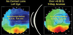 Figure 1a shows DH's pre-fitting corneal topography OS with a paracentral radius of 34.25D (9.85mm). Figure 1b shows the corneal topography over a +6.00D 1Day Acuvue soft lens (Vistakon) with a paracentral radius of 41.00D (8.25mm). Figure 2a shows a spherical GP lens design on DH's left eye with a base curve radius of 43.00D (7.85mm), with a large, fixed central bubble. Figure 2b demonstrates the 43.00D (7.85mm) GP lens on top of the +6.00D 1Day Acuvue.