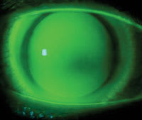Case Study A 47-year-old female presented having undergone well-healed LASIK OU four year ago with two enhancements OU. She had a post-surgical ectasia and complained of blurred vision and dryness. Biomicroscopy revealed inferior thinning and epithelial pigment OU. Her K readings were OD 48.00/56.00 and OS 42.50/49.75, and her refraction was OD +2.00 –7.50 x92 = 20/100 and OS +2.00 –6.50 x88 = 20/60. We fit her with SynergEyes KC with parameters of 6.90mm base curve, 8.5mm skirt curve, 14.5mm diameter, –8.50D 20/30+ OD and 6.70mm base curve, 8.5mm skirt curve, 14.5mm diameter, –6.50D 20/25 OS. Figure 1 shows the fluorescein pattern OS. The patient wears the lenses for approximately 14 hours each day.