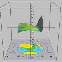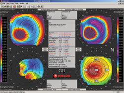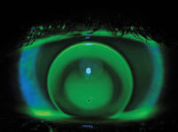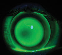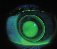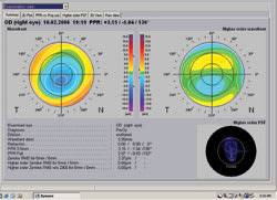 Next we fit the patient with an 11.0mm OAD XLT reverse geometry lens and checked the lens fit with fluorescein (Figure 5). The aberrometry readings in Figure 6 indicate the amplitude of aberrations with the same patient in the XLT lens design. Figure 7 shows the three-dimensional illustration of a decreased level of higher-order aberrations, which measured 1.17μm OD with the XLT lens design.