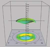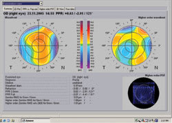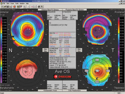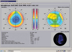 Subject #1 Figure 1 shows Subject 1 wearing an 8.6mm overall diameter regular geometry contact lens. Figure 2 shows the initial topography, which demonstrates decentration of the apex. Our aberrometry measurements show that these habitual lenses resulted in a high amount of overall aberrations (Figure 3). Figure 4 shows a three-dimensional illustration of this patient's higher-order aberrations, which measured 3.56μm on the right eye with the habitual lens design.