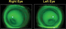 The fitting procedure begins by selecting a diagnostic lens with a base curve radius equal to the steepest K reading. We placed high-molecular-weight fluorescein into the bowl of the lens and placed the lens on the eye. The GP portion of the lens should exhibit slight apical clearance or "feather touch" across the apex of the cone and midperipheral lens bearing (Figure 1). The soft lens skirt should exhibit 0.25mm of blink-induced movement.