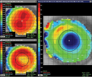 Figure 1 shows a mildly astigmatic cornea fit with a spherical lens. The difference in sag was 58μm between the flat and steep meridians. Note the small treatment zone, and the K readings showed an increase of the corneal cylinder from 1.20D to 1.609D.