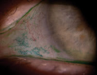 Along the lines of using vital dyes, lissamine green has essentially replaced rose bengal dye in clinical practice. In evaluating contact lens-related dry eye, lissamine green assessment of conjunctival staining is often the most significant abnormal finding and can be very dramatic (Figure 4). You can also monitor this staining for improvement with treatment.