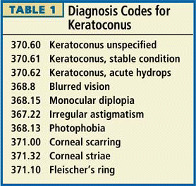 is a keratoconus suspect, code the patient signs and symptoms (Table