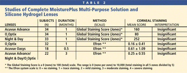 TABLE 2 Studies of Complete MoisturePlus Multi-Purpose Solution and Silicone Hydrogel Lenses |