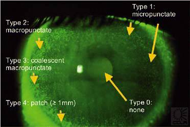 Figure 1 shows the CCLRU punctate staining types. Type 0 means there is no staining. Type 1 is micropunctate; Type 2, macropunctate; Type 3, coalescent macropunctate staining; and Type 4 is a coalescent patch of 1mm or greater in size.