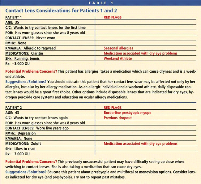 After reviewing the histories, it becomes apparent that these patients need to be fit differently. Each patient has three red flags that make contact lens fitting more of a challenge. If you don't address these potential problems from the beginning, these patients will have a higher propensity to discontinue contact lens wear.