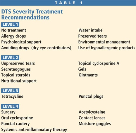 Based on DTS recommendations, therapy may include artificial tears (preserved or non-preserved), ointments, nutritional support, topical steroids, topical cyclosporine, tetracyclines or punctal plugs. If necessary, you should remove patients from contact lens wear until their tear film stabilizes.