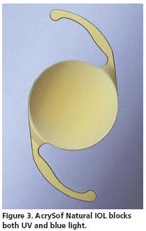 Wavelength Blockage All IOLs block some UV light, but blue-light absorbing IOLs are also available. Studies are ongoing to determine which type of absorption provides the best retinal protection as well as the best visual performance under photopic and mesopic lighting conditions. AcrySof Natural (Alcon, Figure 3) blocks both UV and blue lights.