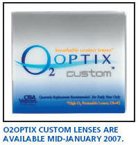 CIBA Vision is making available later this month its O2Optix Custom silicone hydrogel lens. Manufactured in sifilcon A, the lenses have a Dk/t of 117 at –3.00D and are available for high myopia, high hyperopia, large and small corneas, steep and flat corneas and aphakia.