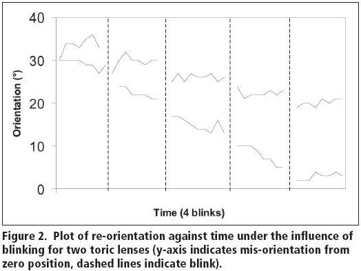 With some designs, some rotation also occurs between blinks, presumably because of the watermelon seed effect described by Hanks (1983). This theory suggests that the upper lid squeezes thicker portions of the lens, causing it to rotate until a point of equilibrium is reached. The plots in Figure 2 show the re-orientation for two different toric fittings. In one case, virtually all of the rotation takes place during the blink while, in the other, a similar amount of rotation takes place between blinks as during the blink.