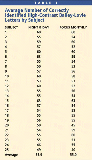 Two subjects who initially screened for inclusion in the study chose to drop out because of poor lens comfort. The remaining 25 subjects completed all four visits. Each of them demonstrated a good soft lens fit with proper limbal to limbal centration with both the Night & Day and the Focus Monthly lenses. Tables 1 and 2 show the average number of correctly identified high- and low-contrast letters after two weeks of lens wear, by subject, for each lens type. Table 3 shows approximated Snellen equivalent acuity based on the total number of correctly identified letters.