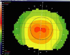 Figure 1. Corneal molding secondary to long-term wear of a back-surface aspheric multifocal GP lens. |