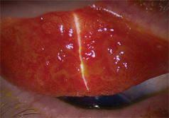 External examination shows bilateral ptosis, and slit lamp evaluation reveals giant (>1.0mm) papillae and superior palpebral conjunctiva thickening in all zones of both eyelids. The keratoconus in his left eye is relatively mild and without scarring. The graft in his right eye is clear.