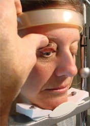 Reach around the other side of the slit lamp with your right hand and grasp between your thumb and forefinger the central area of the upper eyelid margin and lashes (Figure 2). Pull the eyelid away from the eye and then in an upward direction with your right hand while simultaneously pushing down on the superior region of the lid with the thumb of your left hand. Once you are able to pin the lid margin against the brow, you can release one hand to manipulate the slit lamp for examination of the superior tarsal plate (Figure 3).