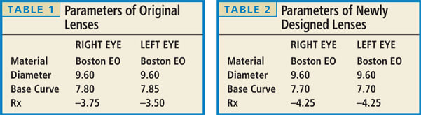 The patient wore her lenses an average of 12 hours per day. Table 1 details her original lens parameters.