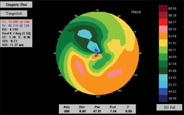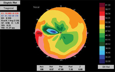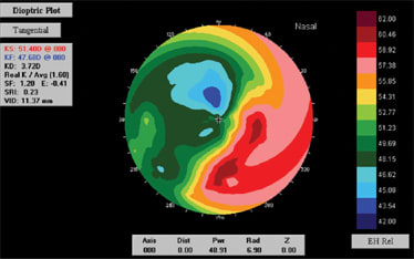 Patient #1, a 54-year-old male high school teacher, had received corneal grafts for both eyes about 20 years ago due to keratoconus. He had worn various types of GP lenses in the past. On his last visit, he reported good visual acuity with his contact lenses but increased sensation due to lack of lens stability. His topographies showed high amounts of irregular astigmatism with areas of extreme flatness and steepness very close to each other (Figures 1 and 2).