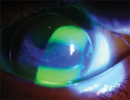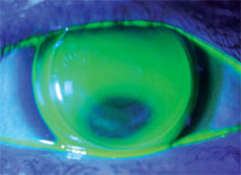 These lenses provided a good fit, and based on over-refraction were ordered with powers of –14.50D OD and OS with a front-surface optical zone of 7.50mm to cover the scotopic pupil. To reduce lid sensation, we ordered the lenses in the hybrid Harmony material (Vista optics, www.vista-optics.com), which has an 8mm GP central zone with a hydrogel material skirt. Figures 3 and 4 show the final fits, which achieved acuities of almost 20/20 in both eyes. The transition between the GP and hydrogel parts of the lens is visible in the right eye, and the excess of fluorescence at the lens edge is due to the use of low-molecular-weight fluorescein, which stained the hydrogel material.