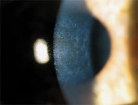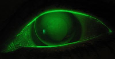 She underwent PRK in both eyes on separate surgery dates one week apart. Unfortunately, she slowly developed sub-epithelial haze (Figure 1) and regression of her myopia in both eyes despite aggressive treatment with topical steroids. An attempt to scrape the sub-epithelial scarring and application of mitomycin in her left eye three years post-operatively failed to reduce the haze. Eight years after PRK her refraction is OD -4.75 DS 20/25 and OS -6.25 DS. The patient was successfully refitted into GP contact lenses (Figure 2) and is satisfied with the vision they provide.