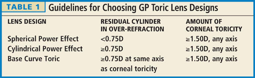 Stealing liberally from lessons that I've learned from Tim Edrington, OD, MS, FAAO, at the Southern California College of Optometry, I use the following guidelines (Table 1) when considering the appropriate GP toric lens design.