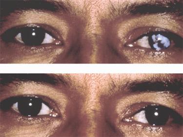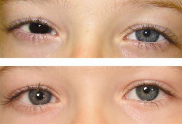 Figure 6. 6a (top) shows a patient prior to application of a tinted prosthetic contact lens. 6b (bottom) shows the improved cosmetic appearance after lens application.