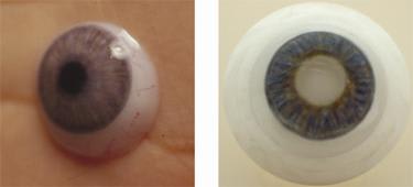 Several companies manufacture "stock" prosthetic soft lenses, which have some set parameters and iris color choices (Figure 1). The opaque stock prosthetic contact lenses are usually designed to be replaced annually. The available colors are applied to the front surface of the contact lens as an opaque color "paint" and generally are successful for many patients. In addition to specifying the iris color, other variables to determine include pupil size, base curve radius and power.