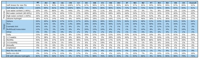 Table 4. Detailed information for prescribed soft lenses only. Data presented for countries reporting ≥250 lens fits. EW = extended wear. Data for materials, designs and replacements pertain to daily wear new fits only.