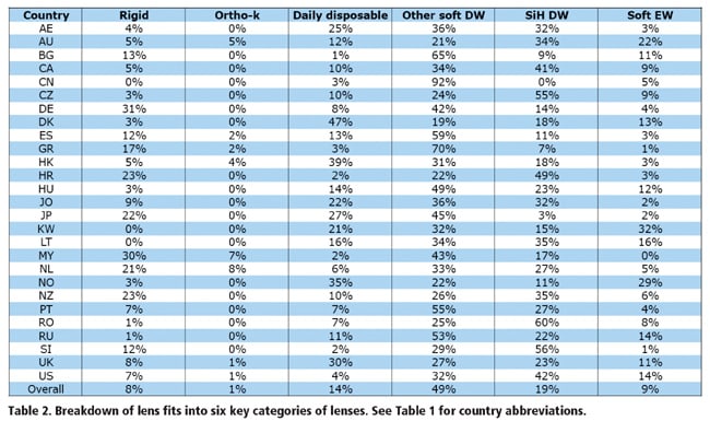 Soft lenses account for more than 90 percent of fits worldwide; they represent 95 percent or more of fits in nine of the 27 countries evaluated and all reported lens fits in China, Kuwait and Lithuania. This year saw a similar rate to previous years of GP lens prescribing at 9 percent of all fits, including 1 percent for orthokeratology (Table 2). This latter modality was reported at 4 percent of fits or greater for Australia, Hong Kong, Malaysia and the Netherlands. Interestingly, the reasons for this modality's popularity appear to be different depending on the market. Ortho-k is presumably popular in Hong Kong because of the high prevalence of myopia. The Netherlands is home to a number of important ortho-k innovations, and practitioners in this country have a history of greater GP fitting. Orthokeratology may be popular in Australia because of the significant amount of research in the field conducted in that country.