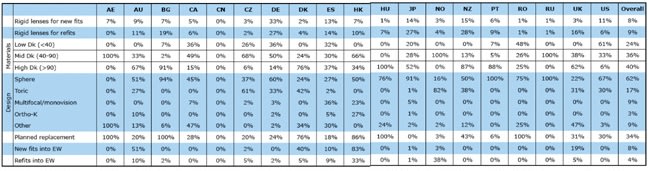 Table 3. Detailed information for prescribed GP lenses only. Data presented for countries reporting ≥250 lens fits. EW = extended wear. Data for materials and designs pertain to daily wear new fits only.