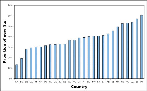 Figure 1 shows the proportion of new fits around the world, from China where only 13 percent of fits were described as new, to Portugal with 61 percent. In 21 of the 27 surveyed countries, refits were more common than new fits.