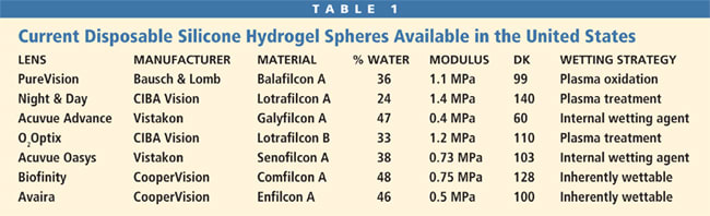 At present, there are seven different disposable silicone hydrogel lens materials commercially available in the United States. In order of their initial market entry as soft spheres, they are: balafilcon A (PureVision, B&L), lotrafilcon A (Night & Day, CIBA Vision), galyfilcon A (Acuvue Advance, Vistakon), lotrafilcon B (O2Optix, CIBA), senofilcon A (Acuvue Oasys, Vistakon), comfilcon A (Biofinity, CooperVision) and enfilcon A (Avaira, CooperVision).