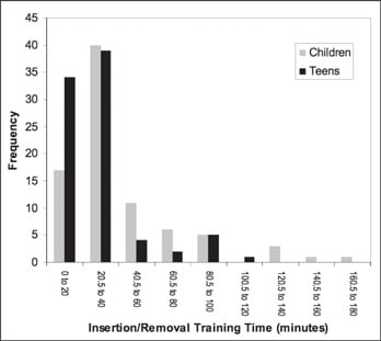 Figure 1. Histogram of times required for application and removal training for children and teens.