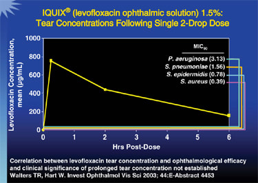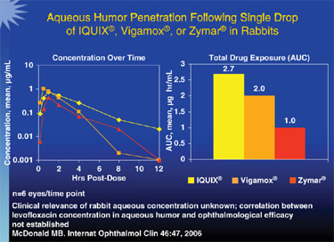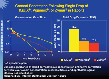 A study (Holland et al, 2007) that looked at drug concentrations in human corneal tissue and aqueous humor samples collected during previously planned penetrating keratoplasty found that concentrations of Iquix compared to Zymar were much greater than might be predicted from the higher concentration in the bottle.