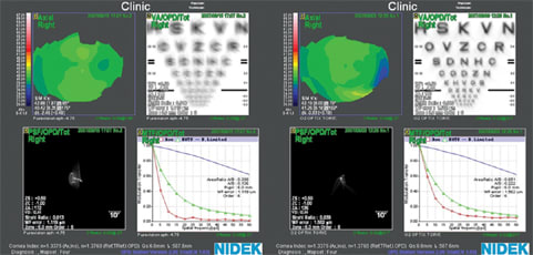 • Nidek OPD-Scan Aberrometer – this device uses retinoscopic double pass aberrometry and differs from other aberrometers in that it measures the time that light takes to reach photo detectors after reflecting off of the retina and passing through the optical system. Other methods attempt to determine the position of points passing through the optical system and are projected onto a lenslet array (or a disc of tiny lenses). By using a time-based analysis (versus a position-based analysis), this instrument has a broader dynamic range of measurement, higher resolution and increased accuracy. Clinically this is similar to dynamic retinoscopy.