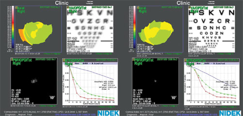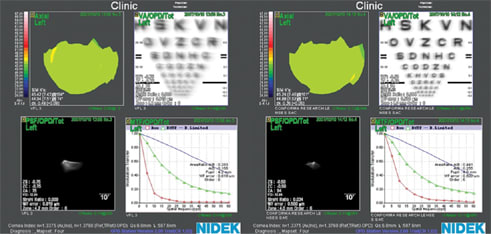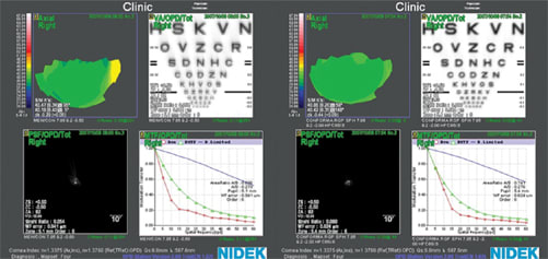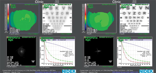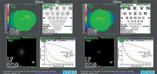 In an attempt to evaluate the performance of HD Optics, I had two identical lenses prepared except that one lens incorporated a front-surface corrected curve (HD Optics) while the other did not. I placed each lens on the patient's eye and, after settling, performed a wavefront scan through the lens. Figure 7 shows the comparison between a Menicon spherical contact lens and the Conforma HD Optics contact lens. While visual acuity was subjectively acceptable for both lenses, PSF and MTF (change from 0.636 to 0.741) charts demonstrated an overall improvement in retinal imaging with the aberration-controlled design. Figure 8 shows similar improvements in visual acuity, PSF and MTF (change from 0.559 to 0.734) for the aberration-controlled spherical lens manufactured by Conforma Laboratories compared to a spherical GP lens manufactured in Boston XO (Bausch & Lomb).