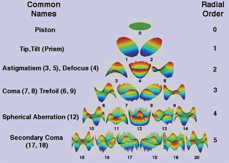 Of particular interest with wavefront analysis are new terms that describe various aberrations of the visual system such as spherical aberration, coma, trefoil, quadrafoil and others that collectively describe higher-order aberrations (HOAs).