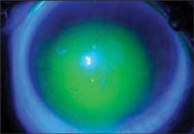 Figure 1 shows a lens that has not been plasma treated. As you can see, the lens has large areas where the tear film is not wetting the anterior surface. The lens will usually look dull and have a beading, non-wetting appearance.