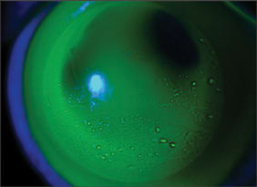 If beading persists and moves around the lens with the blink, this indicates that it's due to poor tear film from the dry eye condition. In such cases, vision is decreased and comfort is reduced. However, be cautious. Although infrequent, GPs can arrive from the laboratory with a lens material flaw, and you can have a non-wetting spot due to lens material/manufacturing quality.