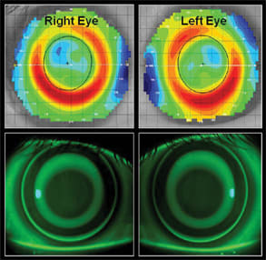 Figure 1. Patient's corneal topography and fluorescein photos post-CRT fitting.