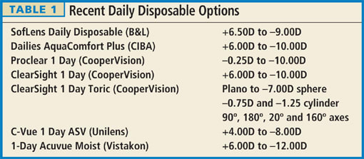 While in many countries daily disposable lenses hold a greater market share, U.S. practitioners have been less inclined to fit daily disposables. After a number of years of flat performance, only small increases in use have occurred over the past two years. In contrast, the past year has seen a flood of new daily disposable products (Table 1).